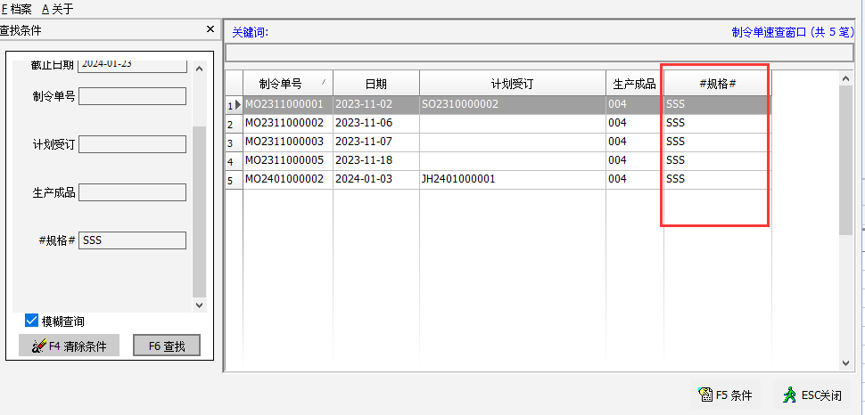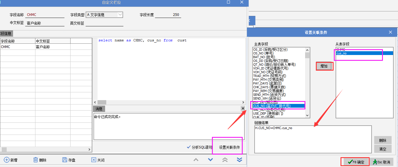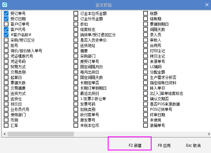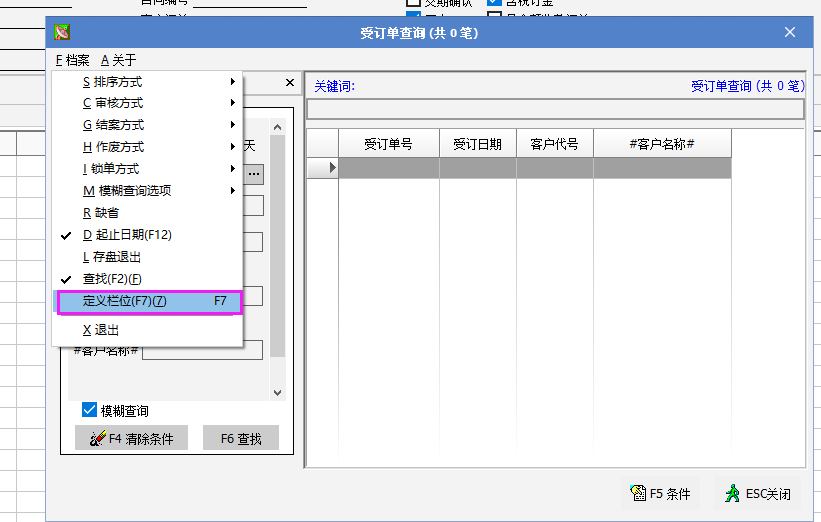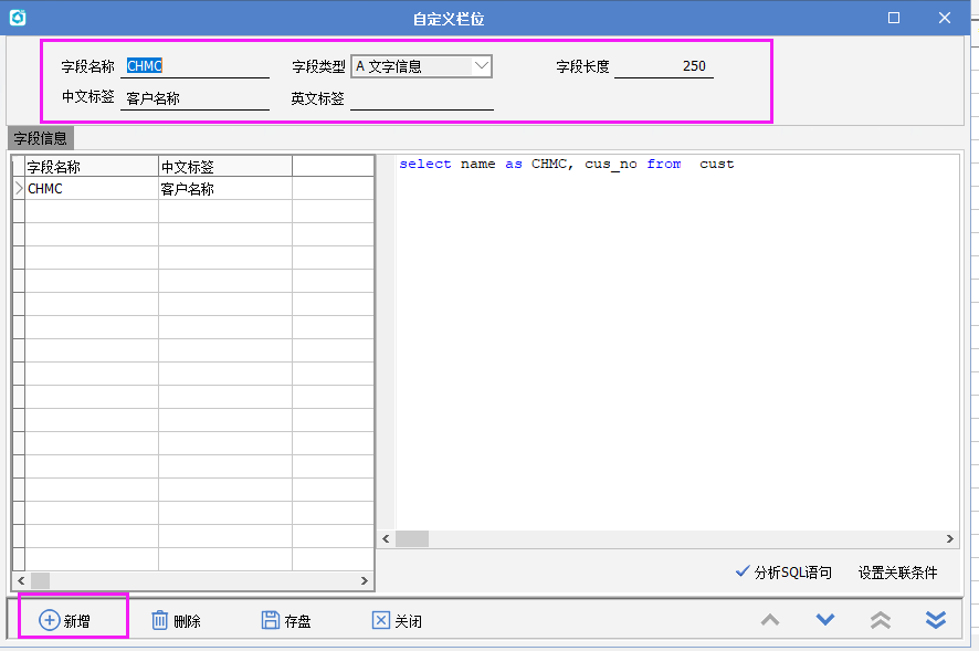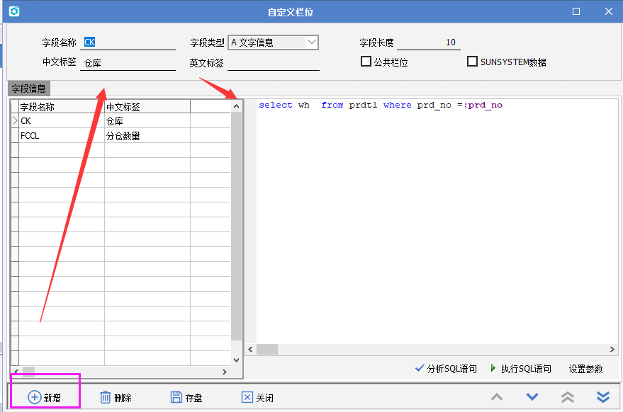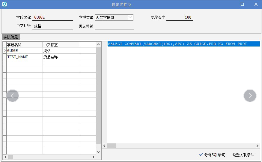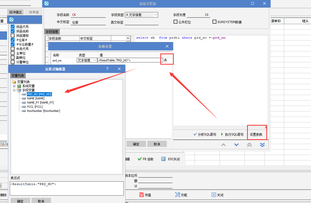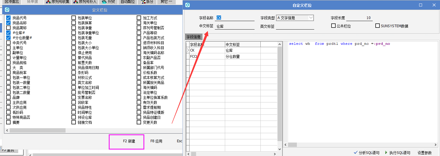 查詢窗口有兩種不同的設(shè)置方法,一種是直接查詢的窗口,例如貨品查詢,一種是速查的窗口,例如單據(jù)速查。 一、直接查詢窗口(貨品查詢) 1.貨品欄位點(diǎn)擊三個(gè)點(diǎn)進(jìn)入查詢窗口 2. 條件—定義欄位 3.F2新建—自定義欄位 4. 新增,填寫字段名稱,中文標(biāo)簽,字段類型,字段長(zhǎng)度等欄位,例如:新建一個(gè)倉(cāng)庫(kù)的自定義字段,字段名稱為:CK,中文標(biāo)簽:倉(cāng)庫(kù),字段類型:A文字信息,字段長(zhǎng)度:10, 語句格式 select欄位名稱?from表名 where 條件 select wh from prdt1 where prd_no =:prd_no 5.設(shè)置參數(shù):分倉(cāng)存量PRDT1表的PRD_NO字段與單據(jù)表身字段變量PRD_NO 相關(guān)聯(lián) 6.退出單據(jù),再重新進(jìn)入單據(jù),進(jìn)入定義欄位,才會(huì)顯示新建的自定義字段(倉(cāng)庫(kù)),再勾選上倉(cāng)庫(kù)(自定義字段,點(diǎn)擊F8應(yīng)用。 二、速查—查詢窗口 1.檔案—自定義字段 2.F2新建 3.新增,填寫字段名稱,中文標(biāo)簽,字段類型,字段長(zhǎng)度等欄位,例如:新建一個(gè)客戶名稱的自定義字段,字段名稱為:CHMC,中文標(biāo)簽:客戶名稱,字段類型:A文字信息,字段長(zhǎng)度:250, 語句格式 select欄位名稱?as?自定義字段名稱,關(guān)聯(lián)字段from表名 select name as CHMC, cus_no from cust 4.設(shè)置關(guān)聯(lián)條件 主表字段:受訂單客戶代號(hào)CUS_NO等于從表字段-客戶廠商資料客戶代號(hào)CUS_NO,兩張表以客戶代號(hào)關(guān)聯(lián)。 5.退出單據(jù),再重新進(jìn)入單據(jù),進(jìn)入定義欄位,才會(huì)顯示新建的自定義字段(客戶名稱),再勾選上客戶名稱(客戶名稱)自定義字段,點(diǎn)擊F8應(yīng)用。 6.規(guī)格的自定義字段比較特殊,規(guī)格要用convert轉(zhuǎn)換成varchar類型的, SQL語句寫法:SELECT?CONVERT(VARCHAR(100),SPC)?AS?GUIGE,PRD_NO?FROM?PRDT |