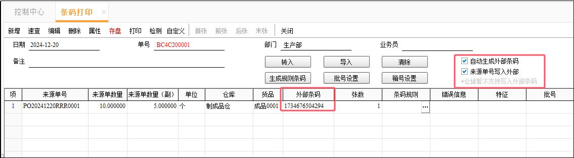 一、要點(diǎn)介紹入庫(kù)掃碼自動(dòng)匹配來源單是現(xiàn)代倉(cāng)庫(kù)管理中提高效率和準(zhǔn)確性的重要手段,通過優(yōu)化掃碼入庫(kù)流程,不用選擇來源單,掃碼自動(dòng)與來源單匹配的方式進(jìn)行入庫(kù),可以顯著提高入庫(kù)效率、降低出錯(cuò)率并優(yōu)化庫(kù)存管理。 二、新功能亮點(diǎn)2.1 提高入庫(kù)效率:通過掃碼自動(dòng)與來源的訂單進(jìn)行匹配,無需手動(dòng)選擇來源訂單,可以快速完成貨物的入庫(kù)操作,減少人工干預(yù)和等待時(shí)間。 2.2 降低出錯(cuò)率:程序自動(dòng)匹配和關(guān)聯(lián)的訂單與貨品信息,降低了人為選擇訂單錯(cuò)誤的風(fēng)險(xiǎn)。 2.3 暫時(shí)只支持采購(gòu)入庫(kù),且來源單為采購(gòu)訂單的情況。 三、功能說明1、生成表身數(shù)據(jù)的唯一碼 ERP條碼打印單表頭勾選“自動(dòng)生成外部條碼”以及“來源單號(hào)寫入外部”,當(dāng)轉(zhuǎn)入來源單“采購(gòu)訂單”數(shù)據(jù)時(shí),表身“外部條碼”欄位自動(dòng)賦值一串唯一碼(1734676504294),不勾選時(shí)不自動(dòng)賦值。 2、T-CODE掃外部條碼入庫(kù) T-CODE進(jìn)入采購(gòu)入庫(kù)單,無需選擇來源的采購(gòu)訂單,點(diǎn)擊掃碼,在條碼界面掃條碼“1734676504294”,會(huì)自動(dòng)帶出對(duì)應(yīng)的采購(gòu)訂單貨品信息進(jìn)行采購(gòu)入庫(kù)。 |
