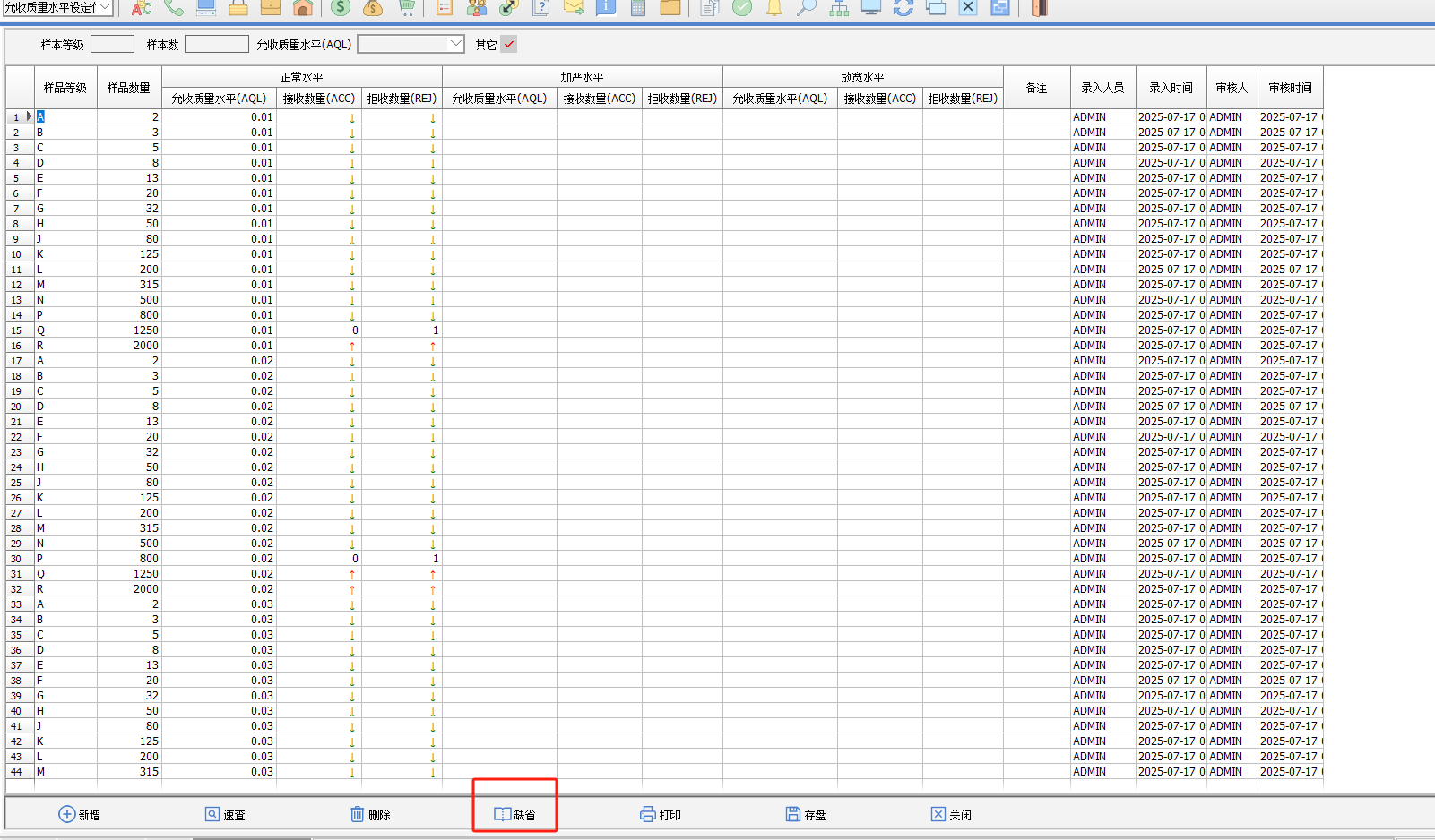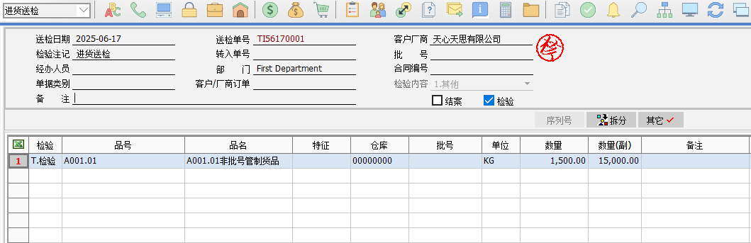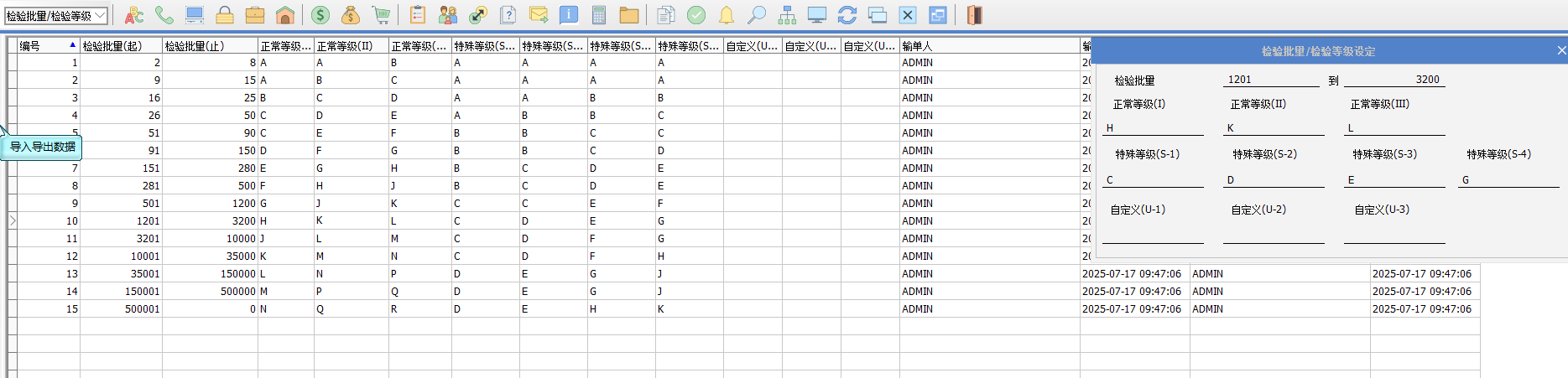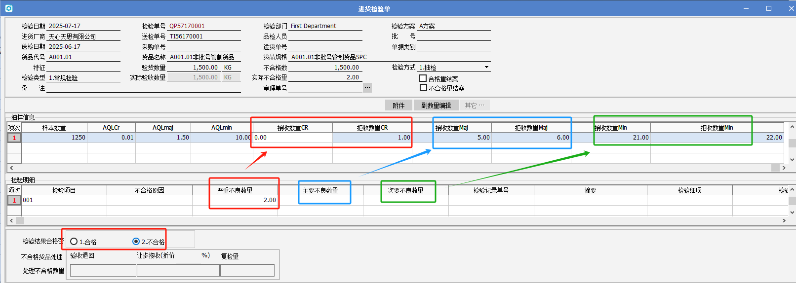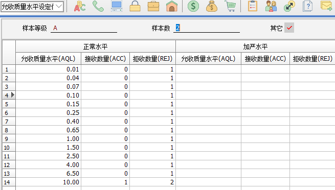 一、要點介紹根據(jù)客戶反饋,國標規(guī)定的允收質(zhì)量水平(AQL)允許輸入向下(↓)或向上(↑)箭頭符號,用以表示樣本等級的浮動方向。這種浮動機制將同步影響樣本等級和樣本數(shù)量的確定,以及對應的接收數(shù)量和拒收數(shù)量。本次修改需更新至2025年6月13號之后的A版。 二、正文內(nèi)容************* 1. 營業(yè)人資料-其他-特殊檢驗模式選擇2、抽檢方案模式或3、不管制。 2. 允許質(zhì)量水平設定:點擊缺省,將載入最新的標準檔數(shù)據(jù)。 原來做法:允許質(zhì)量水平(AQL)對應的接收數(shù)量(ACC)和拒收數(shù)量(REJ)是一一對應的數(shù)值。 2.現(xiàn)在做法:允許質(zhì)量水平(AQL)對應的接收數(shù)量(ACC)和拒收數(shù)量(REJ)為浮動機制,可以錄入向下箭頭或向上箭頭。后續(xù)的檢驗單,根據(jù)驗貨數(shù)量和抽樣等級到檢驗批量/檢驗等級去取對應的樣本等級,再根據(jù)該樣本等級和 AQLCr到允收質(zhì)量水平取值,如果為↑,則表示向上取值,直到取到具體的數(shù)字;如果是↓,則表示向下取值,直到取到具體的數(shù)字,根據(jù)該數(shù)字,再取該行對應的樣本等級和樣本數(shù)量。 3. 以進貨送檢的抽樣檢驗流程,舉例說明。 3.1 進貨送檢,送檢數(shù)量為1500。 3.2 需設置以下基礎資料: A、允收質(zhì)量水平設定作業(yè)(點缺省帶出標準檔) B、檢驗批量/檢驗等級設定(點缺省帶出標準檔) C、檢驗方案設定作業(yè):可根據(jù)自己實際情況設定檢驗方案,錄入抽樣等級、AQLcr、AQLmaj、AQLmin等欄位值。 D、貨品檢驗方案設定作業(yè):可設定好檢驗的貨品對應哪個檢驗方案。 3.3 進貨檢驗單: 表頭轉(zhuǎn)入進貨送檢單: A、表頭根據(jù)送檢品號帶出【貨品檢驗方案設定作業(yè)】設定的方案。 B、根據(jù)方案,將檢驗項目、抽樣等級,AQLcr、AQLmaj、AQLmin的值帶到表身抽樣信息窗口。 C、根據(jù)驗貨數(shù)量1500+抽樣等級II到【檢驗批量/檢驗等級設定】取到等級為K。 D、根據(jù)等級K和進貨檢驗單的AQLcr 0.01,去【允許質(zhì)量水平】獲取相應的樣品等級和樣品數(shù)量。將樣品等級、樣品數(shù)量、接收數(shù)量、拒收數(shù)據(jù),帶到進貨檢驗單的抽樣信息窗口相應的欄位。 同樣的方法,取到AQLmaj為1.5對應接收數(shù)量Maj、拒收數(shù)量Maj等。 注意:當送檢量小于樣品數(shù)量,進貨送檢單的樣本數(shù)量就取送檢量,若大于樣本數(shù)量,就取樣品數(shù)量。 E、再錄入檢驗明細的不良數(shù)量,即可判定檢驗結(jié)果是否合格。根據(jù)下圖的不良數(shù)量對應接收數(shù)量和拒收數(shù)量范圍來判定是否合格。最后單據(jù)保存即可。 |