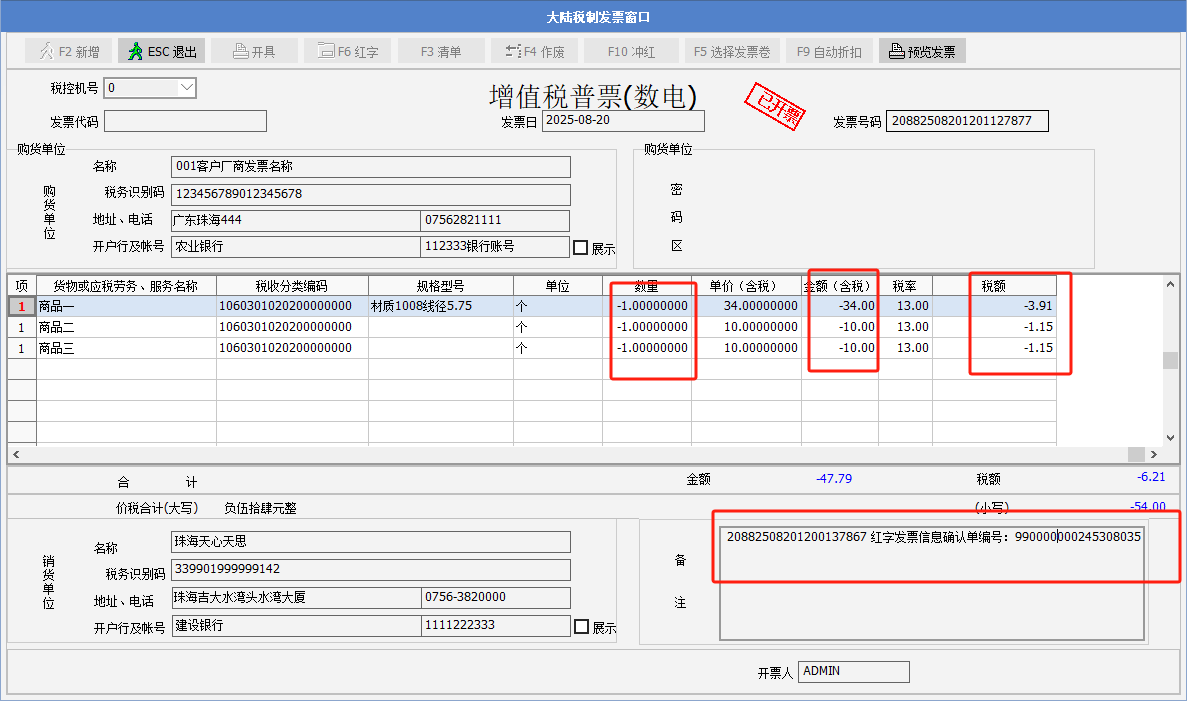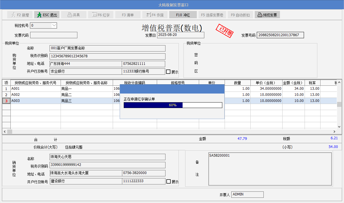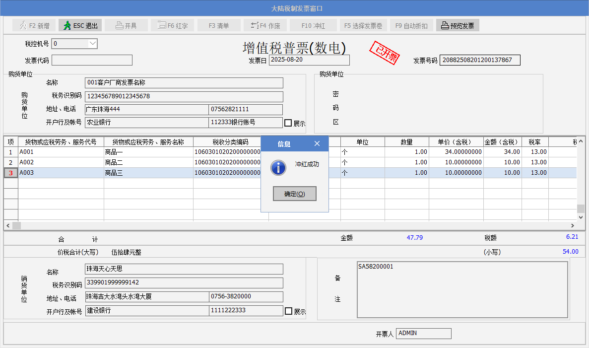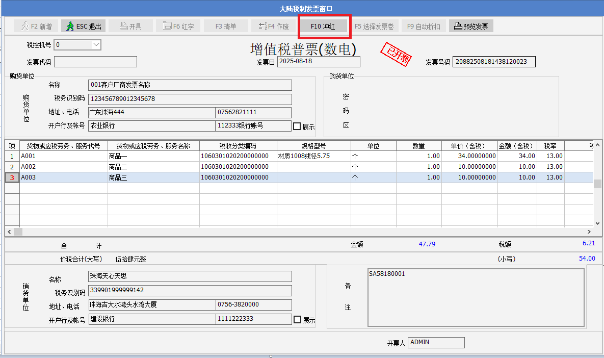 一、要點(diǎn)介紹銷售方開出數(shù)電發(fā)票,在客戶沒有確認(rèn)前,若發(fā)現(xiàn)開出的數(shù)電發(fā)票開錯(cuò)了,以前是需要開票人員到稅控開票系統(tǒng)做沖紅,現(xiàn)在可以在sunlike里做沖紅操作。實(shí)現(xiàn)的效果:如銷貨單開出A數(shù)電發(fā)票,沖紅后,可以重新修改單據(jù)數(shù)據(jù)再次開B發(fā)票。Sunlike請(qǐng)升級(jí)到2025年8月21號(hào)或之后的365A版。 二、正文內(nèi)容************* 1. Sunlike 在增值稅數(shù)電開票界面,增加沖紅的按鈕。 2. 舉例說明:銷貨單開出了增值稅發(fā)票后,需要做沖紅,點(diǎn)發(fā)票窗口的F10沖紅按鈕,彈出提示“是否要沖紅當(dāng)前發(fā)票?” 3. 沖紅過程: 4. 彈出提示“沖紅成功”,點(diǎn)確定。Sunlike通過諾諾網(wǎng)接口獲取到?jīng)_紅發(fā)票號(hào)碼,備注中列示--紅字發(fā)票信息確認(rèn)單編號(hào),表身的數(shù)量以及金額欄位顯示為負(fù)數(shù)。 5. 紅沖發(fā)票可以預(yù)覽,界面如下: 6. 單據(jù)的發(fā)票紅沖后,可以修改單據(jù),繼續(xù)開出新的數(shù)電發(fā)票。 |