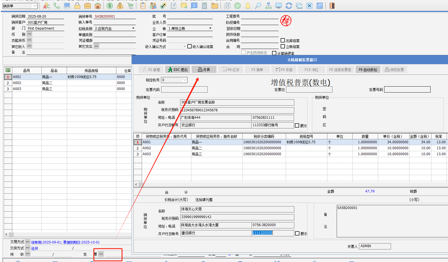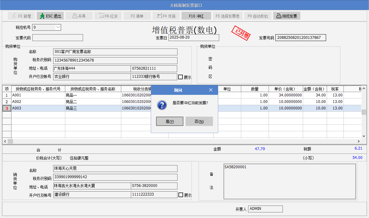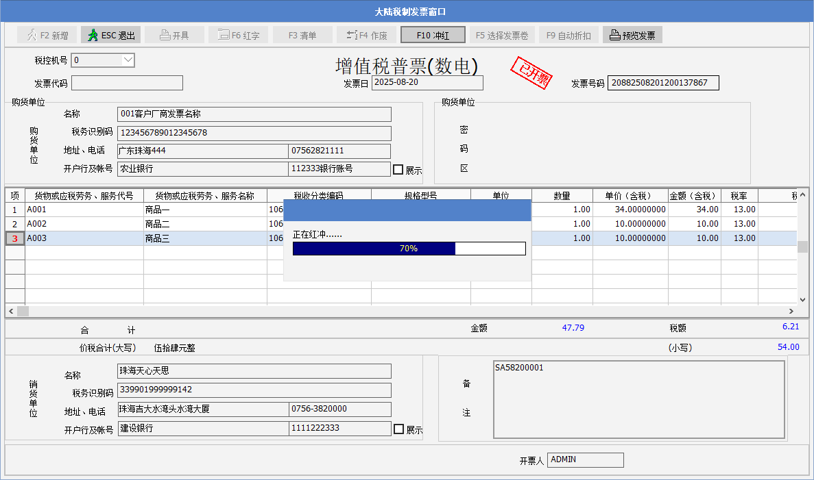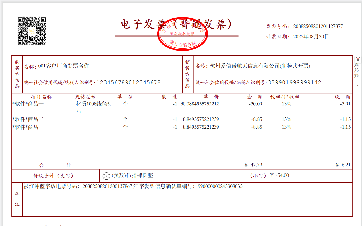 一、要點(diǎn)介紹銷售方開出數(shù)電發(fā)票,在客戶沒有確認(rèn)前,若發(fā)現(xiàn)開出的數(shù)電發(fā)票開錯(cuò)了,以前是需要開票人員到稅控開票系統(tǒng)做沖紅,現(xiàn)在可以在sunlike里做沖紅操作。實(shí)現(xiàn)的效果:如銷貨單開出A數(shù)電發(fā)票,沖紅后,可以重新修改單據(jù)數(shù)據(jù)再次開B發(fā)票。Sunlike請(qǐng)升級(jí)到2025年8月21號(hào)或之后的365A版。 二、正文內(nèi)容************* 1. Sunlike 在增值稅數(shù)電開票界面,增加沖紅的按鈕。 2. 舉例說明:銷貨單開出了增值稅發(fā)票后,需要做沖紅,點(diǎn)發(fā)票窗口的F10沖紅按鈕,彈出提示“是否要沖紅當(dāng)前發(fā)票?” 3. 沖紅過程: 4. 彈出提示“沖紅成功”,點(diǎn)確定。Sunlike通過諾諾網(wǎng)接口獲取到?jīng)_紅發(fā)票號(hào)碼,備注中列示--紅字發(fā)票信息確認(rèn)單編號(hào),表身的數(shù)量以及金額欄位顯示為負(fù)數(shù)。 5. 紅沖發(fā)票可以預(yù)覽,界面如下: 6. 單據(jù)的發(fā)票紅沖后,可以修改單據(jù),繼續(xù)開出新的數(shù)電發(fā)票。 |