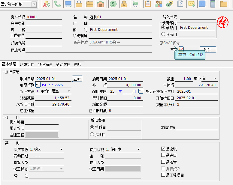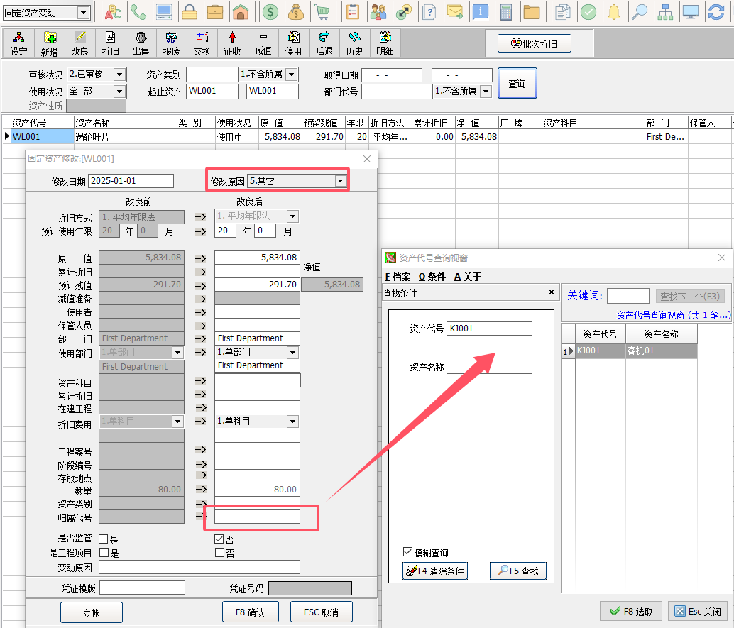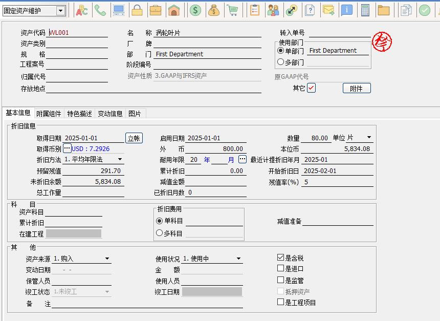 需求:企業(yè)的大型固定資產(chǎn)進(jìn)行功能改良過程,會(huì)購(gòu)入新的配件(配件的性質(zhì)也是固定資產(chǎn)價(jià)值高),該配件按常規(guī)的固定資產(chǎn)進(jìn)行日常折讓、報(bào)廢、減值、停用、改變歸屬資產(chǎn)處理。希望但在報(bào)表(財(cái)產(chǎn)目錄、折舊提列統(tǒng)計(jì)表、固定資產(chǎn)折舊情況表)可以選擇查看大型固定資產(chǎn)的總價(jià)值。 用戶是走固定資產(chǎn)采購(gòu)流程,采購(gòu)入庫(kù)后產(chǎn)生新的固定資產(chǎn)。用固定資產(chǎn)變動(dòng)將配件與主資產(chǎn)進(jìn)行綁定,各種報(bào)表查詢按需查詢即可。以下以客機(jī)和渦輪葉片為例: 新增完畢后,在固定資產(chǎn)變動(dòng)中過濾出配件部分選擇改良-其它,將配件歸屬代號(hào)選擇主固定資產(chǎn)即可 報(bào)表財(cái)產(chǎn)目錄、折舊提列統(tǒng)計(jì)表、固定資產(chǎn)折舊情況表都增加的條件資產(chǎn)列示含所屬來包含配件的金額。 |